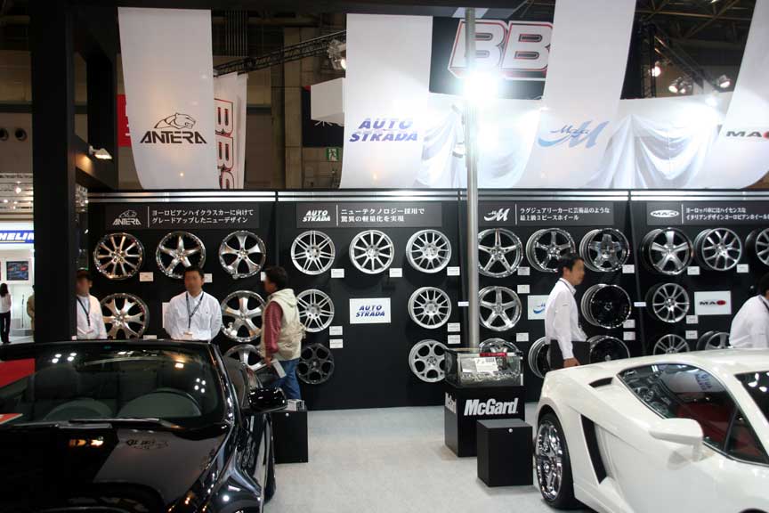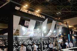 ブースは総合受付を入って正面、屋内会場のほぼ中央にあります。 ブースの奥に儲けられた壁面には多くのホイールが並べられていました。